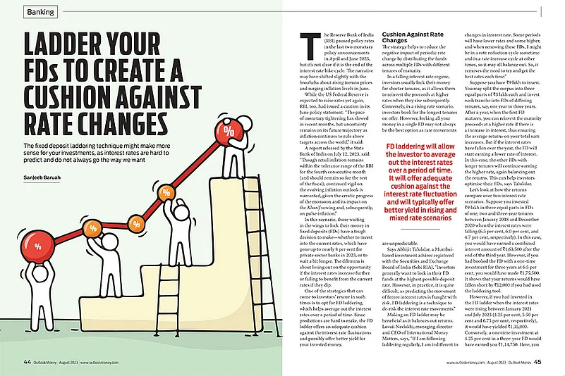 Ladder Your FDs To Create A Cushion Against Rate Changes story in the August 2023 issue of the magazine was interesting. I have invested in fixed deposits (FDs) for a long time but never used this laddering technique. It is because, whatever the interest rate scenario is, rising or falling, I felt I had the option to break the FD and reinvest it when the rates go up. Besides, I always thought tracking multiple FDs would be hard, given my busy schedule. I have invested a significant amount in my two FDs maturing later this year. However, the article has inspired me to try something new. I will certainly go for the laddering strategy this time.