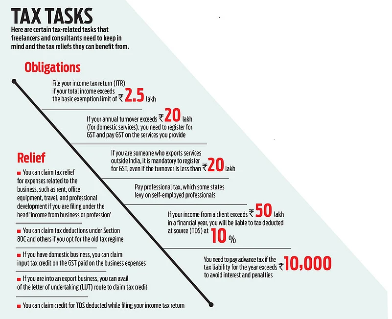 Also, since there is no employer to take care of TDS, freelancers need to pay advance tax on their own. Says Rajiv Bajaj, chairman and managing director, BajajCapital, “Freelancers are required to pay advance tax, which is the tax paid in instalments during the financial year based on the estimated income earned. Failure to pay advance tax may result in interest and penalties.” To read about other tax obligations you may have as a freelancer, read Tax Tasks.
