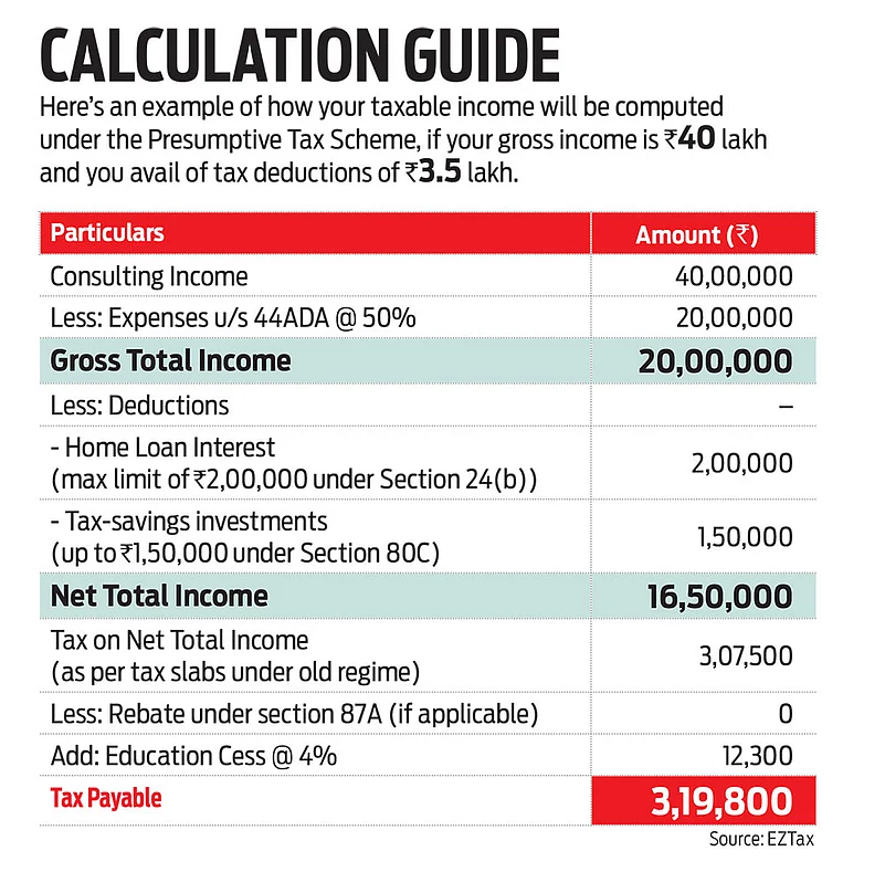 Suneel Dasari, founder and CEO, EZTax.in, an online income tax filing portal, says: “Not all professions come under presumptive taxation. Legal, medical, engineering, or architectural, accountancy, technical consultancy, interior decoration or any other profession as notified by CBDT can opt for presumptive taxation under Section 44ADA. Presumptive taxation can be opted only if the gross receipts from profession does not exceed Rs 50 lakh until FY 2022-23. From FY 2023-24, this limit has been increased to Rs 75 lakh.”
