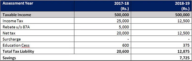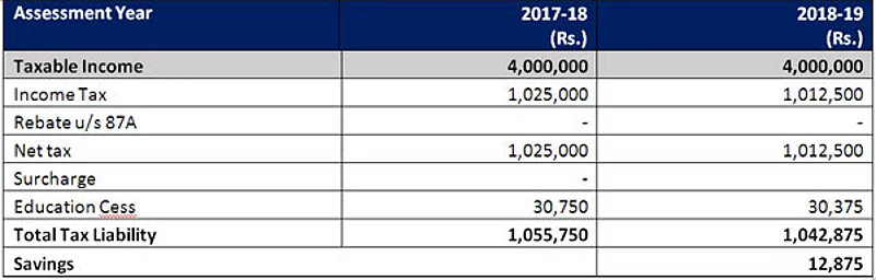 There is some reason to cheer for taxpayers with taxable income up to Rs. 50 lakh as well. These tax payers will also benefit from the reduction in the tax rate for the Rs. 2.5 lakh to Rs. 5 lakh tax slab from 10% to 5%, translating into a reduction in the annual tax by Rs. 12,875 or an increase in the monthly take home pay by Rs. 1073. Refer to the table below to see how the tax will change for a taxpayer less than 60 years of age with a taxable income of Rs. 40 lakh.