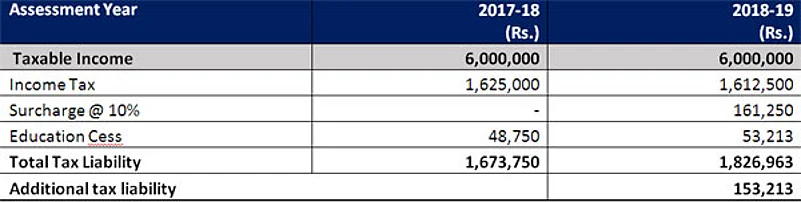 With a view to balancing the loss in the revenue on account of the reduced tax for smaller tax payers, the tax burden on the Rs. 50 lakh plus to Rs. 1 Crore income group has been increased with the introduction of a surcharge of 10% of the tax. As a result, the maximum marginal tax rate for this group will increase from 30.9% to 33.99%. For this group, the benefit of the reduction in lowest tax rate from 10% to 5% will be wiped out by the additional income tax payable in the form of the surcharge (subject to the marginal relief). The table below illustrates how the tax outgo will increase for a taxpayer (less than 60 years of age) with a taxable income of Rs.60 lakh: