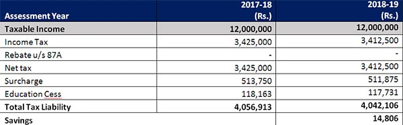The ‘Super rich’ tax payers, i.e the tax payers with income exceeding Rs. 1 Crore will continue to pay the 15% surcharge as they did last year. However, they will also benefit from the reduction in the tax rate from 10% to 5% for the lowest income slab. This is evident from the table below: