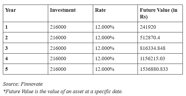 = Rs 11,00,000 * (1 + 0.06) ^ 5